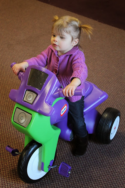 We raided the preschool rooms and found a few fun toys for the kids to ride on.Andrew also got some roller-skates for Christmas and had fun flying around the rooms on them.